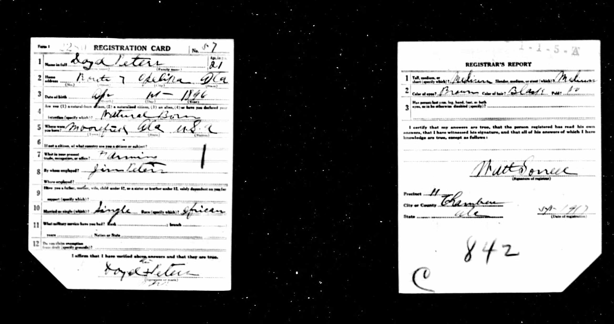 SON: Doyle Peters [Born April, 1896] – After the 1910 Census, Doyle Peters does not appear anywhere in the record again until 1940. But, he does show up in 1917, when he registers to serve in the Army during World War I. The birth information shown on the Registration card is consistent with birth information given in the 1900 Census. In 1940, Doyle is reported on the Census for Anniston, Calhoun County, Alabama, and is residing in the home with Doshia Peters Barrow and her husband Moses Barrow. He reports the head of this household as his “brother-in-law.”